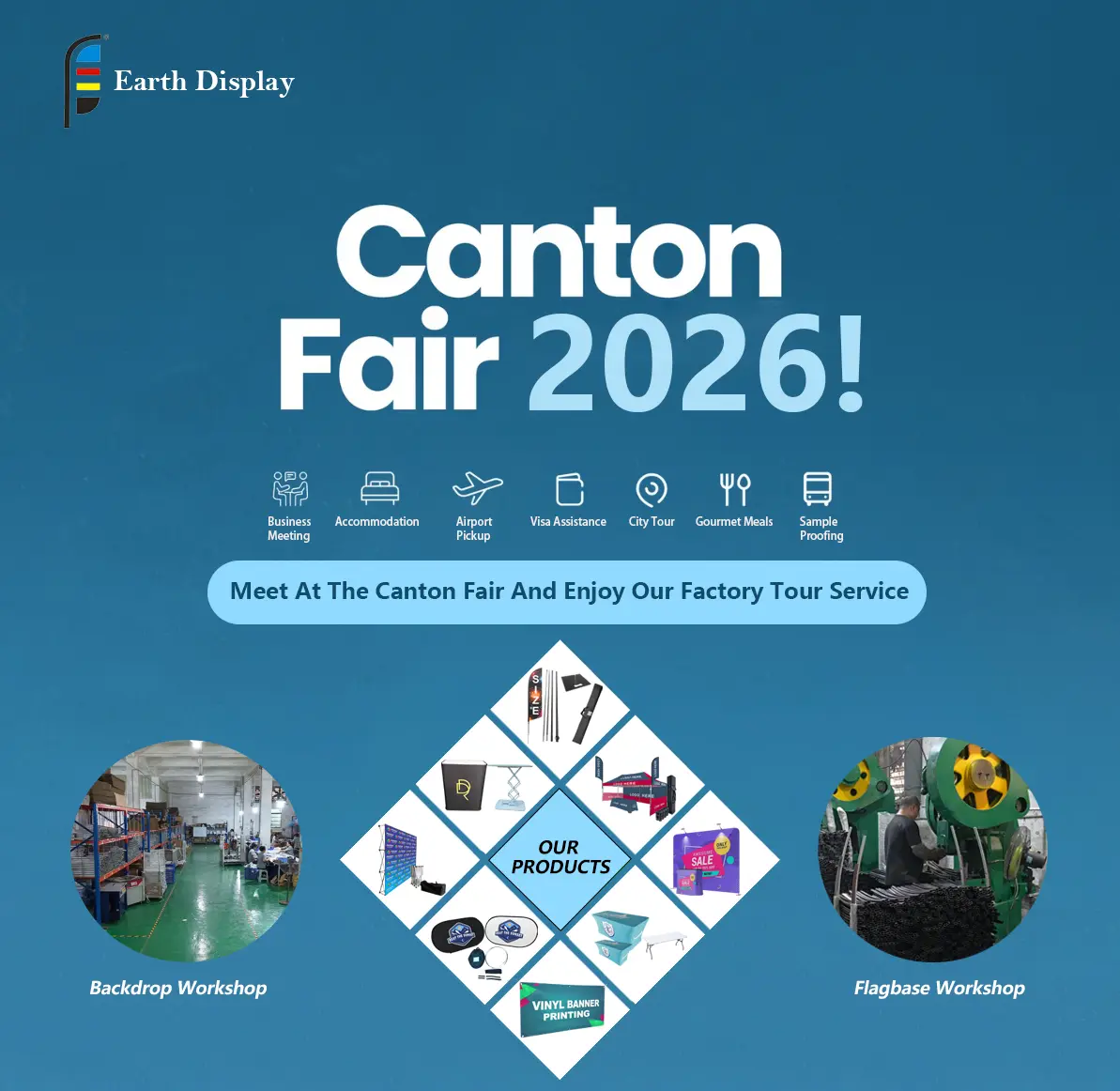 2026 கான்டன் கண்காட்சி வரவிருக்கிறது, எர்த் டிஸ்ப்ளேவில் நாங்கள் உங்களை அங்கே பார்க்கலாம் என்று நம்புகிறோம். இறகுக் கொடிகள், பாப்-அப் பேக்டிராப்கள், ஃபிளாக் பேஸ்கள், தனிப்பயன் வினைல் பேனர்கள் - அடிப்படையில் கண்காட்சிகள் மற்றும் விளம்பரங்களுக்கான எதையும் - இப்போது பத்து ஆண்டுகளுக்கும் மேலாக நாங்கள் உருவாக்கி வருகிறோம். இந்த நேரத்தில், ஆன்லைனில் பேசுவதற்குப் பதிலாக, நாங்கள் என்ன செய்கிறோம் என்பதை நேருக்கு நேர் காட்ட விரும்புகிறோம்.